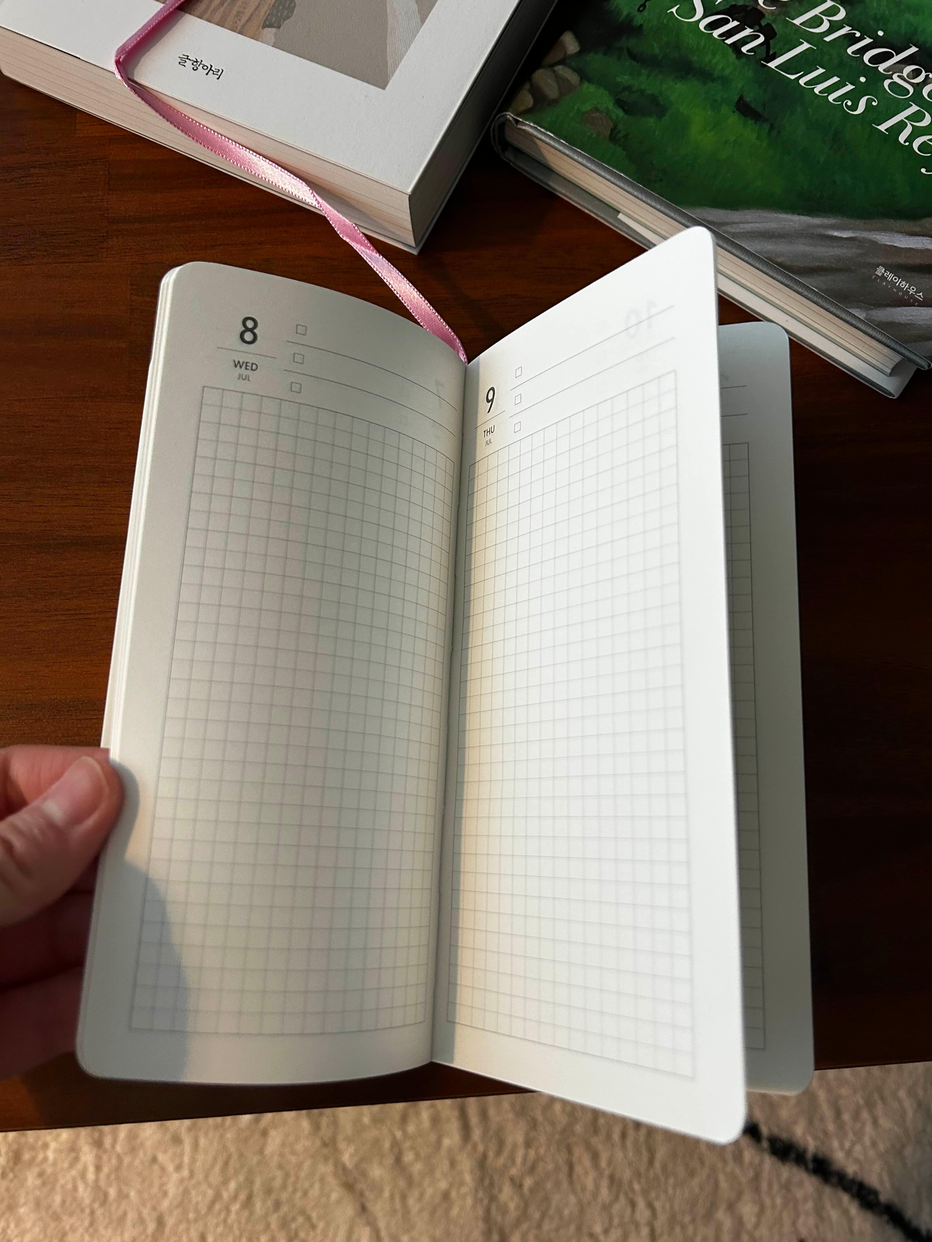 한 손에 다 잡을 수 있는 다이어리 크기에 고무줄로 다이어리가 벌어지는 걸 막을 수 있고,
