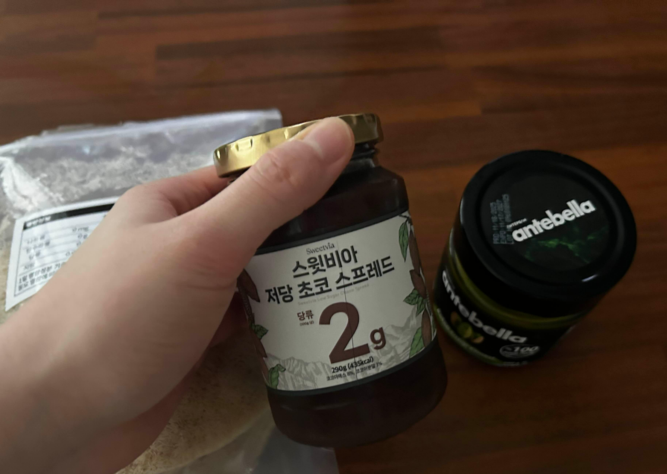 초코 스프레드는 원래는 누텔라로 해야 훨씬 맛나고 자극적이지만 나는 그렇게까지 단 맛을 좋아하지 않아서 저당 스프레드를 사용했는데 충분히 맛있었다. 그리고 피스타치오 원물 100% 스프레드는 워낙 종류도 많아서 쿠팡에서 아무거나 시켰다.