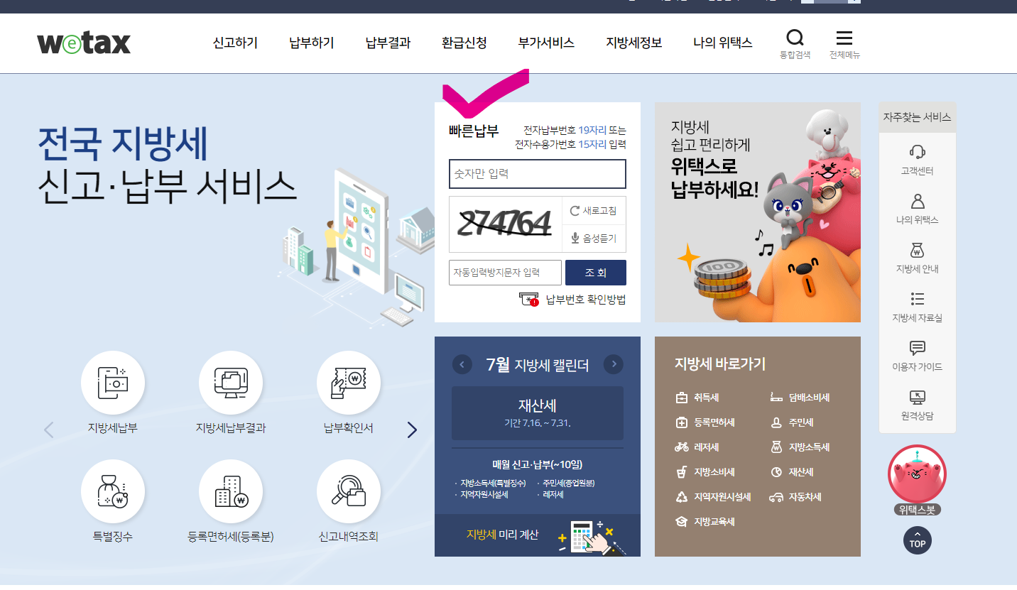 ② 위택스 홈페이지 -> 로그인 필요 없음 빠른 납부 부분에 카톡에서 온 전자납부번호 입력, 자동입력방지문자 입력 -> 조회